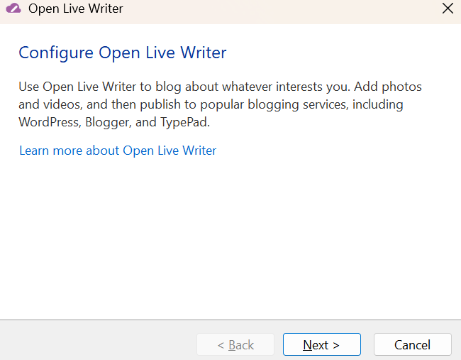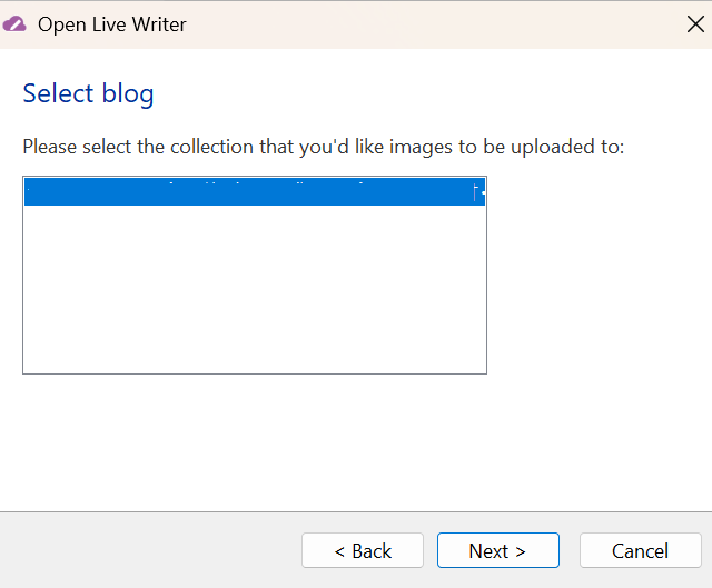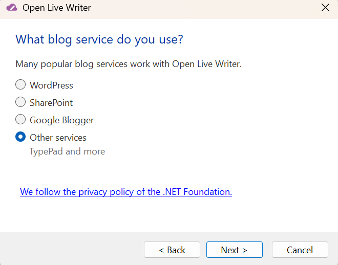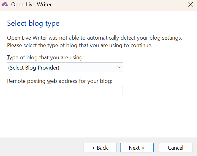 Open Live Writer はブログ設定を自動検出できませんでした。 続行するには、使用しているブログの種類を選択してください。